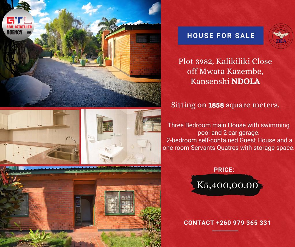 Plot 3982, Kalikiliki Close off Mwata Kazembe, Kansenshi NDOLA. Sitting on 1858 square meters. Three Bedroom main House with swimming pool and 2 car garage, 2-bedroom self-contained Guest House and a one room Servants Quatres with storage space.